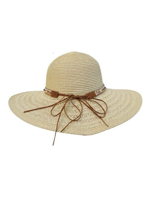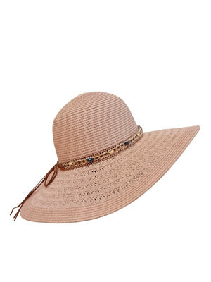 Add some comfort and style to sunny days with this wide brim straw hat with gemstone band. It features a unique hollow pattern brim, and tight braiding that ensures durability and shape.