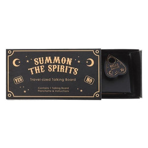Communicate with the unknown on-the-go with this travel-sized talking board. Perfectly compact in a matchbox sized box, it features a mini spirit board and planchette in a black and gold finish, ideal for spontaneous spirit sessions.