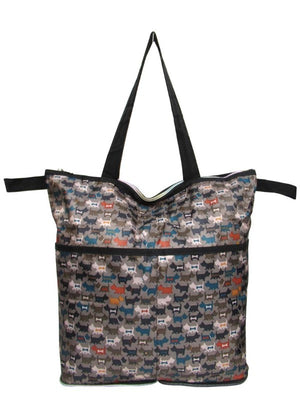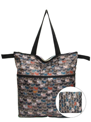This reusable tote bag with zip closure folds into itself for compact, portable storage. It features additional straps that hooks onto the handles of a wheelchair or stroller.