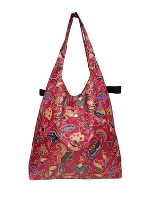 This reusable tote bag with snap closure folds into itself for compact, portable storage. It features additional straps that hooks onto the handles of a wheelchair or stroller.